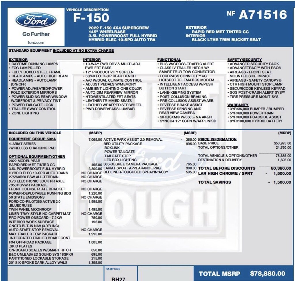 *** PANORAMIC SUNROOF, UNDER FORD FACTORY WARRANTY, EQUIPMENT GROUP 502A, POWER RUNNING BOARDS, 3.5L POWERBOOST FULL HYBRID, FORD CO-PILOT360 ACTIVE 2.0, PRO POWER ONBOARD - 7.2KW, MAX TRAILER TOW PACKAGE, FX4 OFF-ROAD PACKAGE, ON-BOARD SCALES W/SMART HITCH, B&O UNLEASHED SOUND SYS 18SPKR, PARTITIONED LOCKABLE STORAGE, 20" SIX SPOKE DARK ALLOY WHLEELS, BED UTILITY PACKAGE, WIRELESS CHARGING PAD, ORIGINAL MSRP $78,880 ****